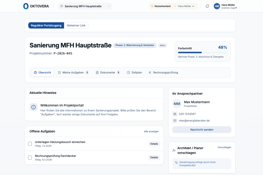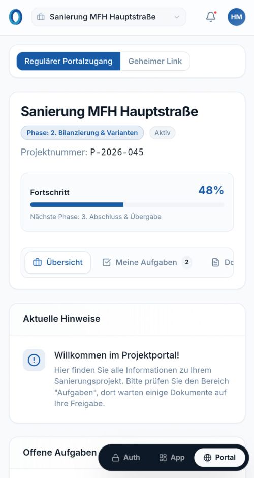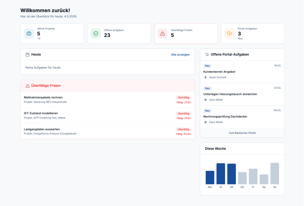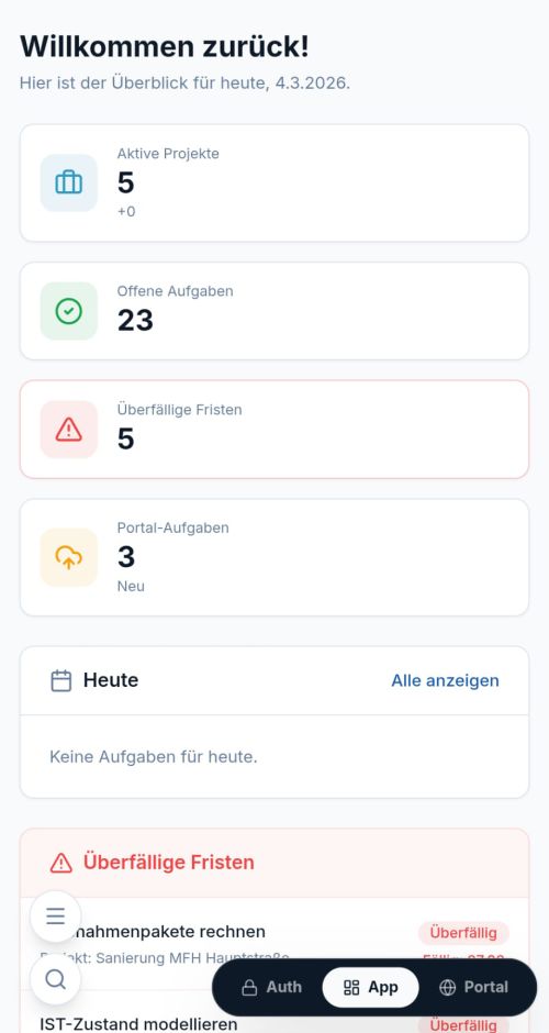 Ob im Büro am Desktop oder unterwegs auf der Baustelle dank optimierter mobiler App: Mit dem maßgeschneiderten Dashboard siehst du sofort deine To-dos, Fristen und neue Uploads deiner Kunden.